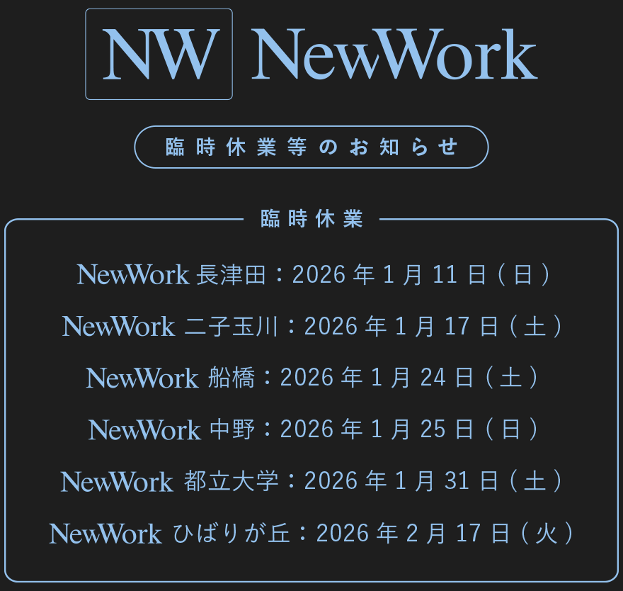 | 2026.01.05 | 直営店 | 『NewWork 小田原』営業時間延長のお知らせ |