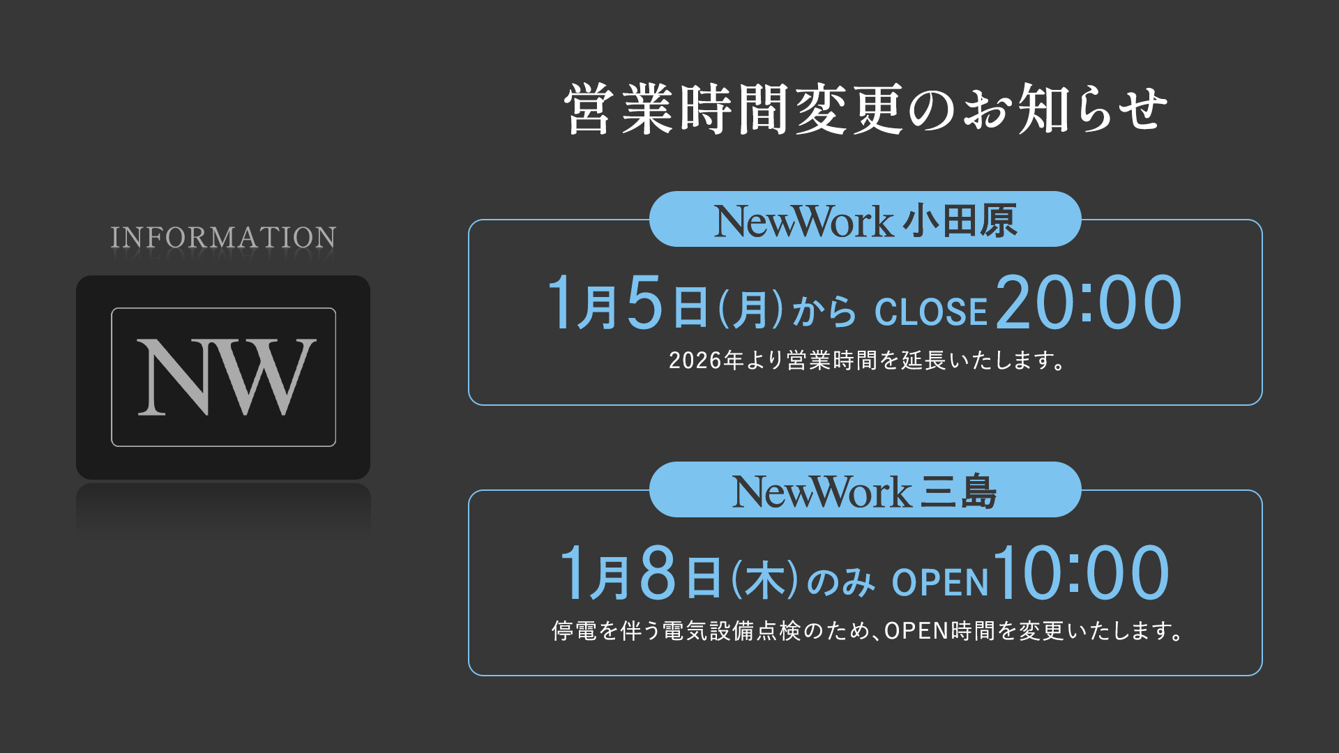 | 2025.11.04 | 直営店 | 『NW三島 1/8(木) OPEN時間変更』等のお知らせ |