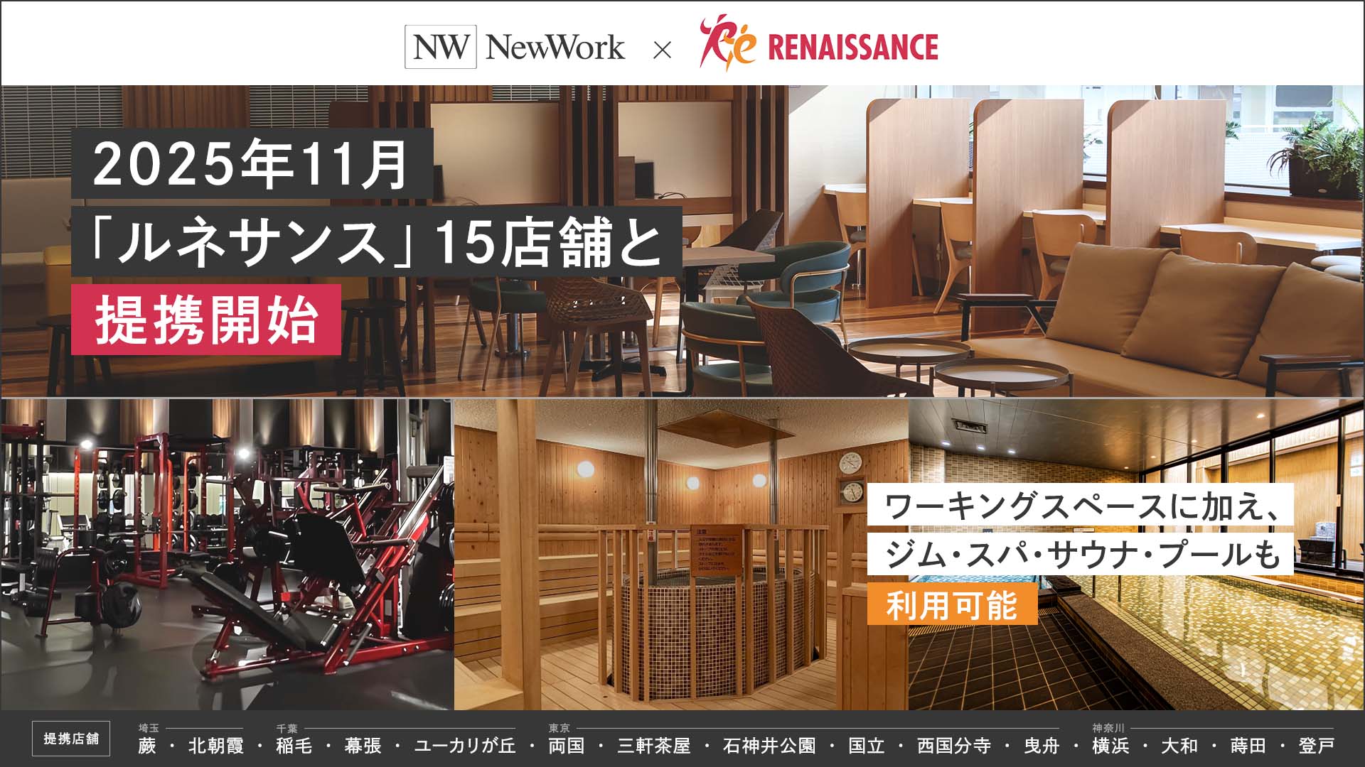 2025年11月4日(火)より、総合スポーツクラブ『ルネサンス』がNewWorkの提携ネットワークに加入いたします。