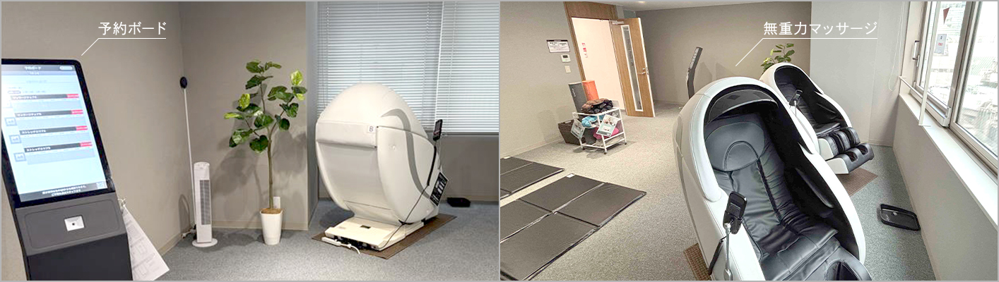 マッサージチェアやストレッチスペースでリラックス&リフレッシュできる場所となり、エリア内の予約ボードで予約※1をすれば、どれも『無料』でご利用いただけます。